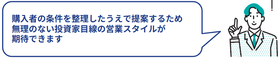 | ・物件の質が高くて安定した収益性がある・購入の状況に合わせた丁寧かつ親身な説明と提案力がある・アフターフォローがしっかりしていて安心感がある |