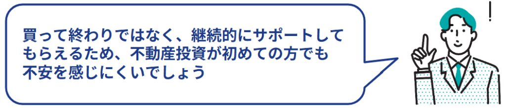 また、不動産投資を検討している方に寄り添った説明と提案、アフターフォローで購入前から購入後まで安心して進められることも大きなポイントです。