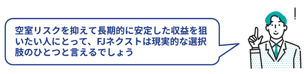 ポジティブな口コミ・ネガティブな口コミを整理すると、FJネクストは短期的な利回りよりも、長期で安定した運用を目指す投資家に向いていることが分かります。