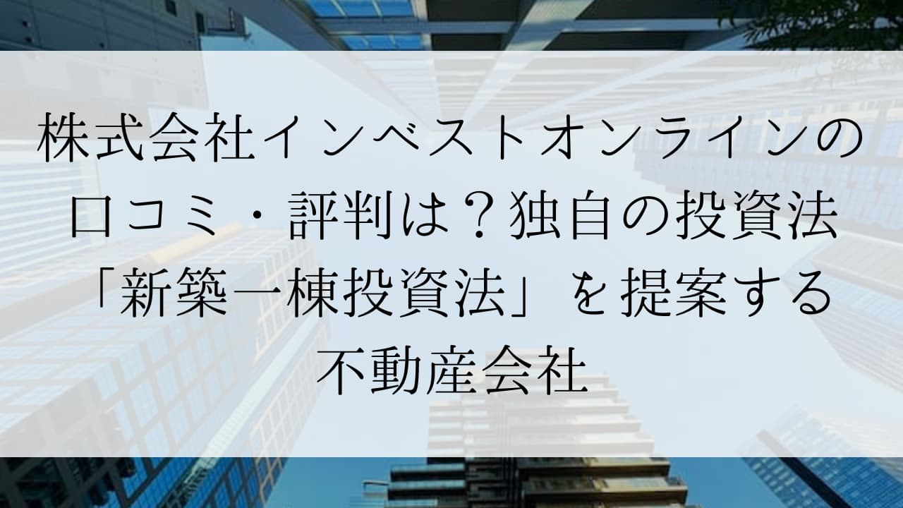 株式会社インベストオンラインは、東京都新宿区に本社を置き、東京23区を中心とした首都圏で新築一棟投資をメインに事業を展開する不動産会社です。新築一棟投資に適した物件の紹介をはじめ、セミナー開催や首都圏の土地買い取りなども手がけています。